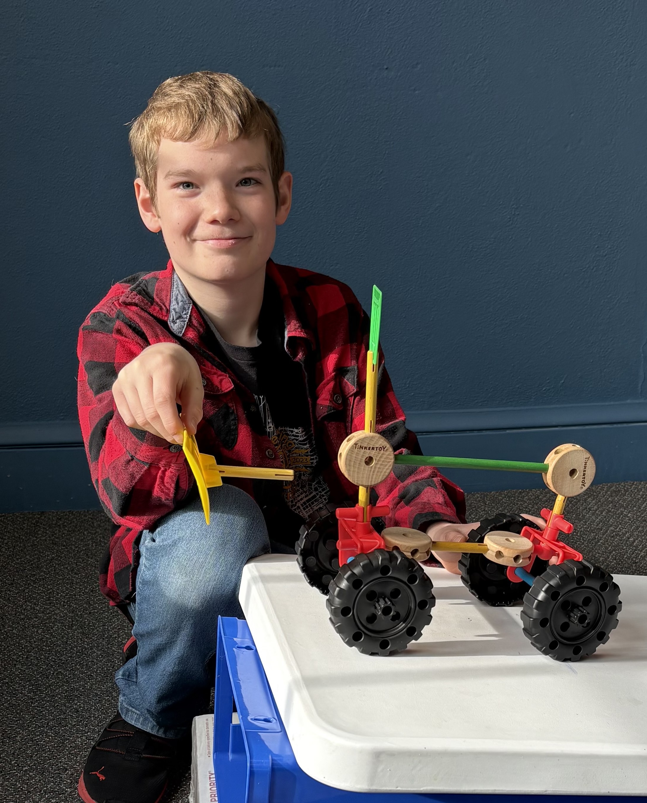 How does a team of children create a working car out of Tinker Toys? By designing and building, trial and error, success and failure, and plenty of fresh starts. The children were encouraged to start fresh and improve on their designs, trying different car models as they kept working toward a car that stayed together and rolled well.